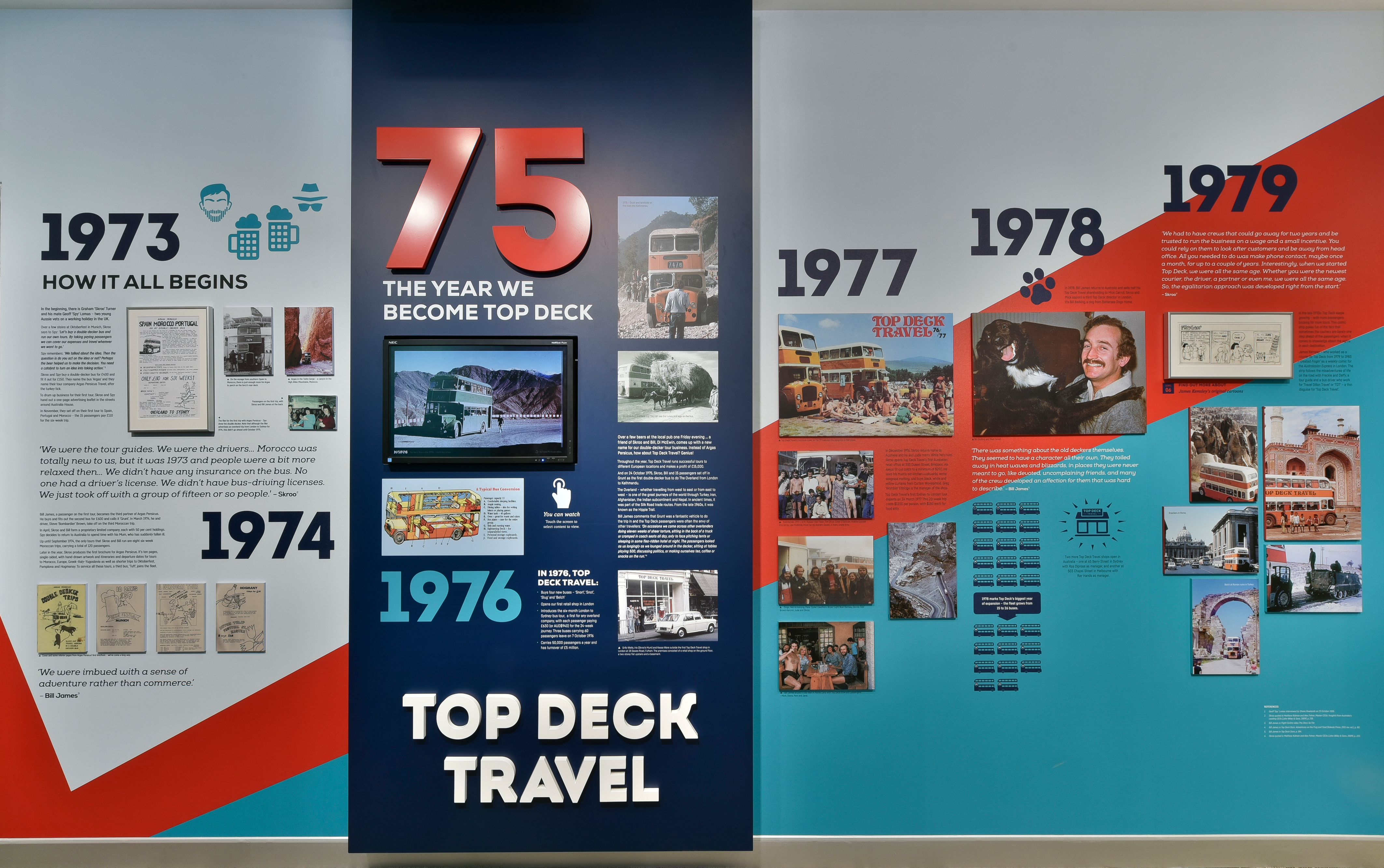 Level 5 – Zoom in timeline 1973 – 1979. Extruded centre panel with interactive video stories, acrylic type. Elsewhere canvas mounted pictures and framed archival material.