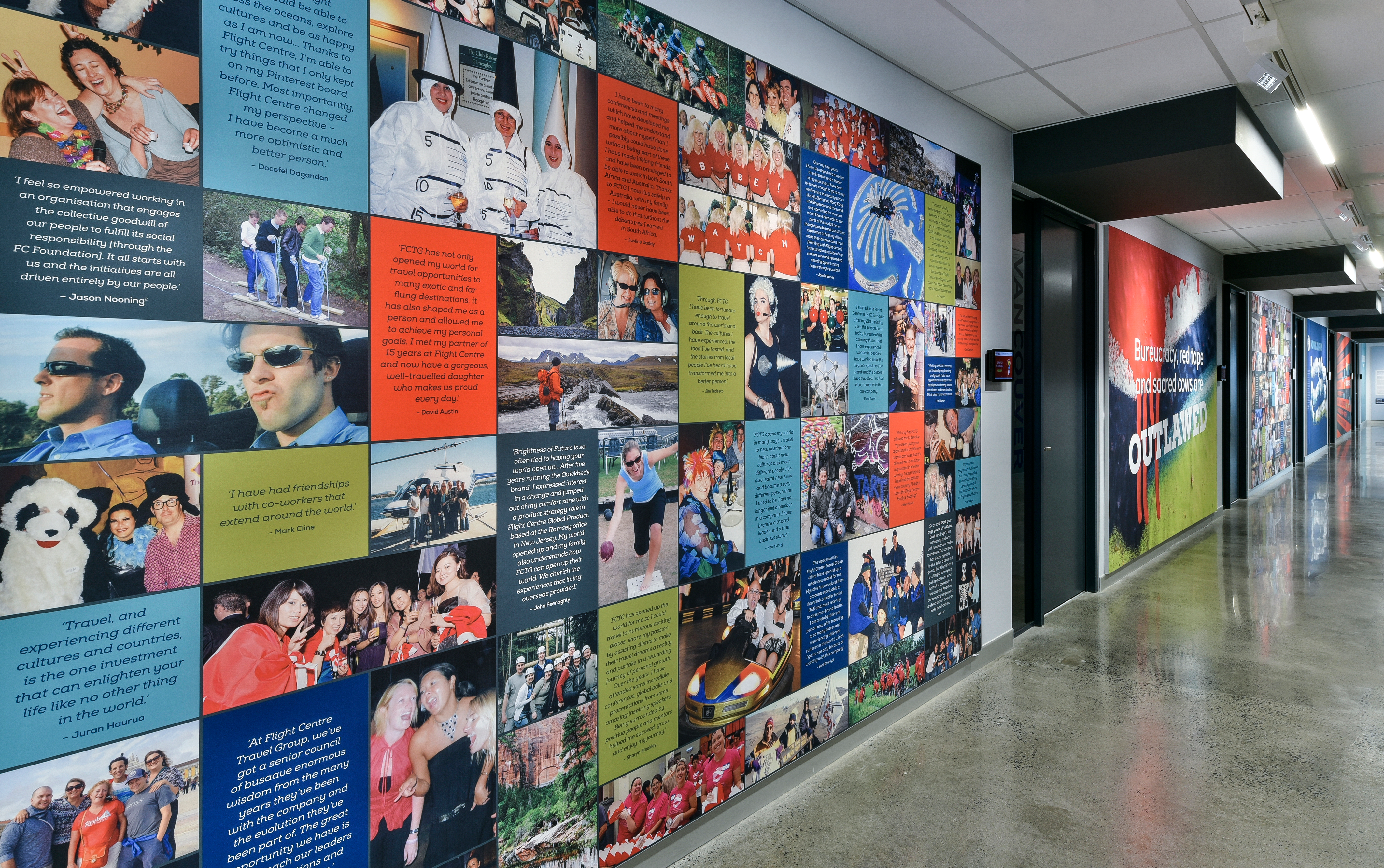 MOFOS consists of nearly a kilometre of visual stories installed in FCTG’s global headquarters at Southpoint, in Brisbane. The story of FCTG is over four decades long. It’s a great big story. The company has around 20 000 people in 14 countries around the world and more than 40 brands.