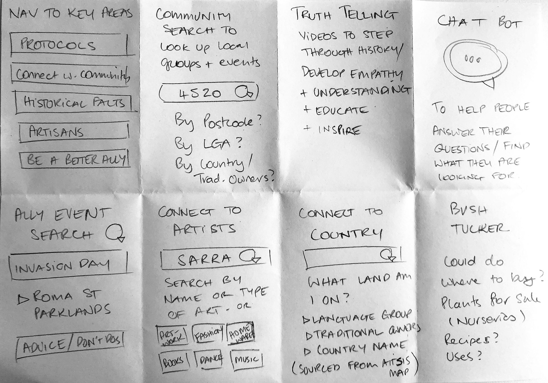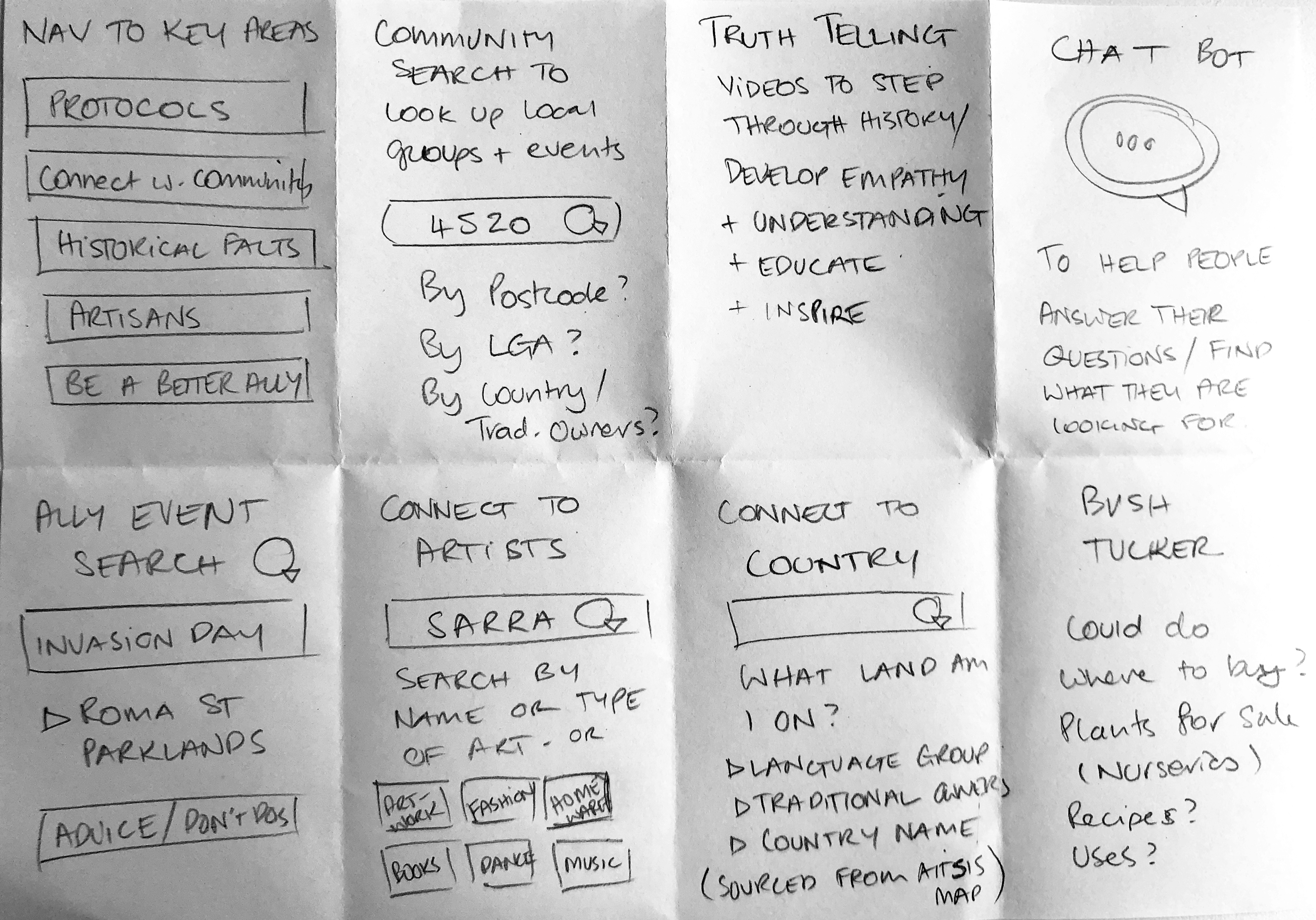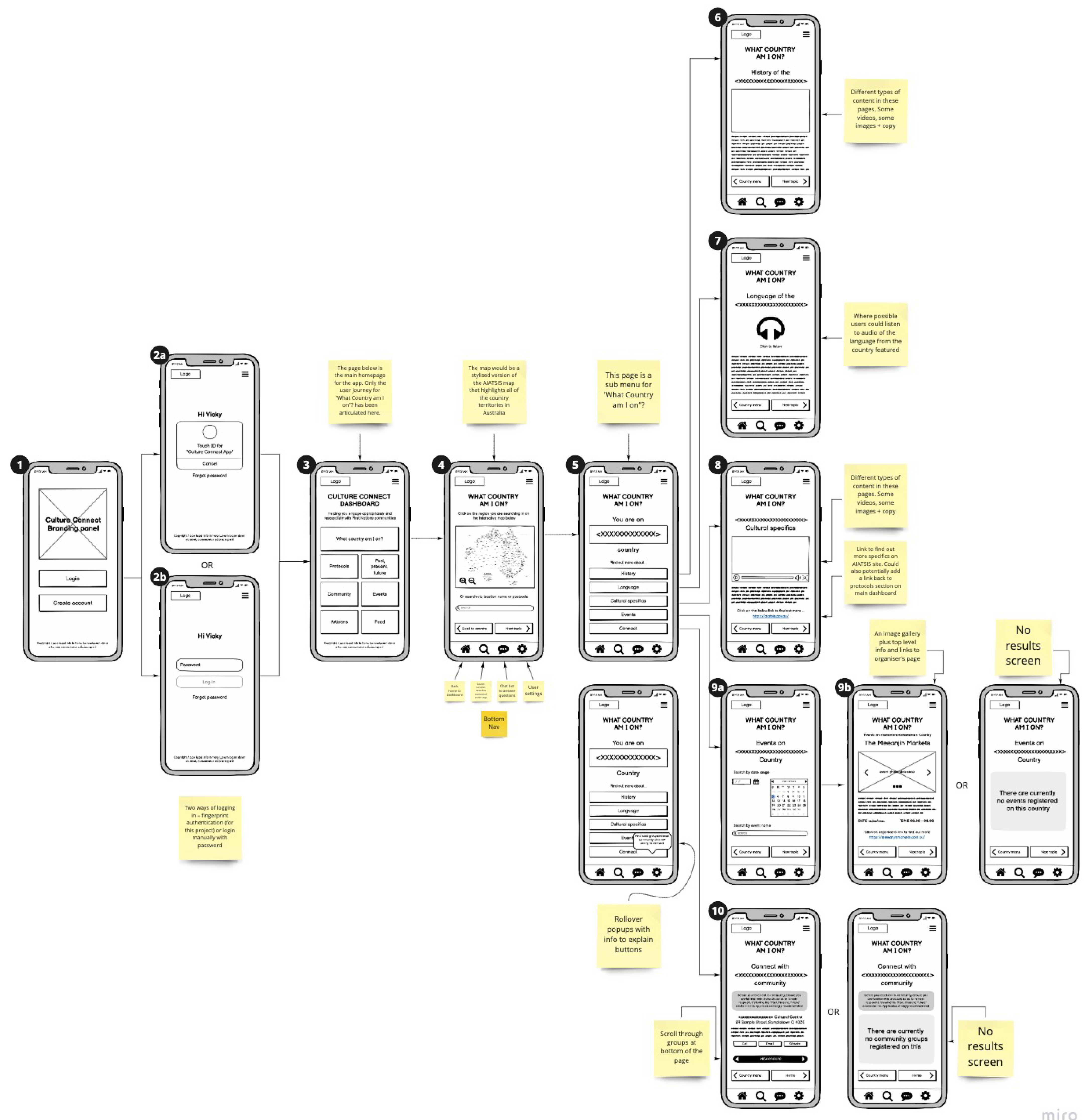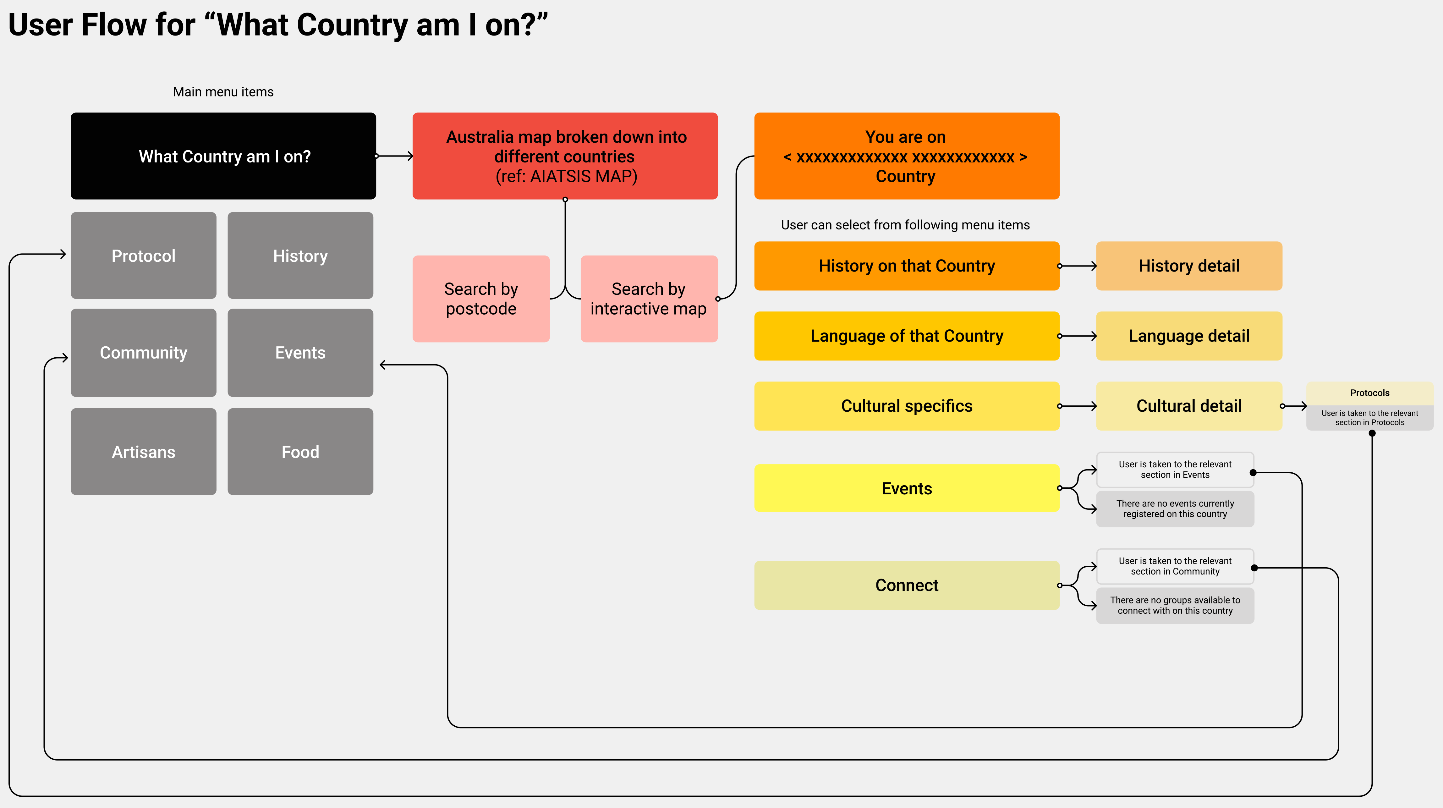 Next I generated a user flow to show how Vicky would find out what First Nations country she was on. She can discover the traditional owner group of the land she was currently on and learn more about them. She can find out about their history in that area, their language, make connections with local community groups as well as find out what events are taking place.