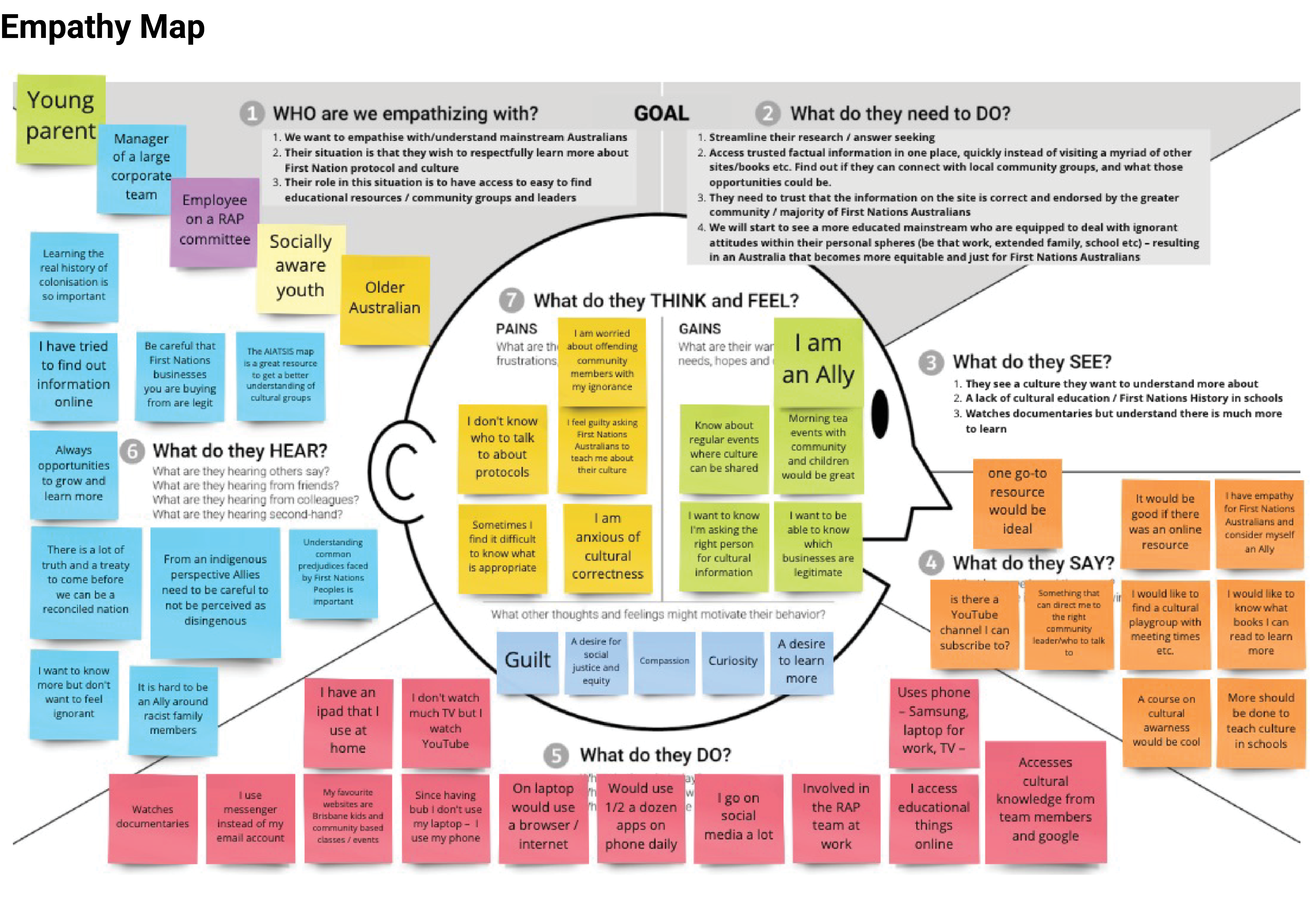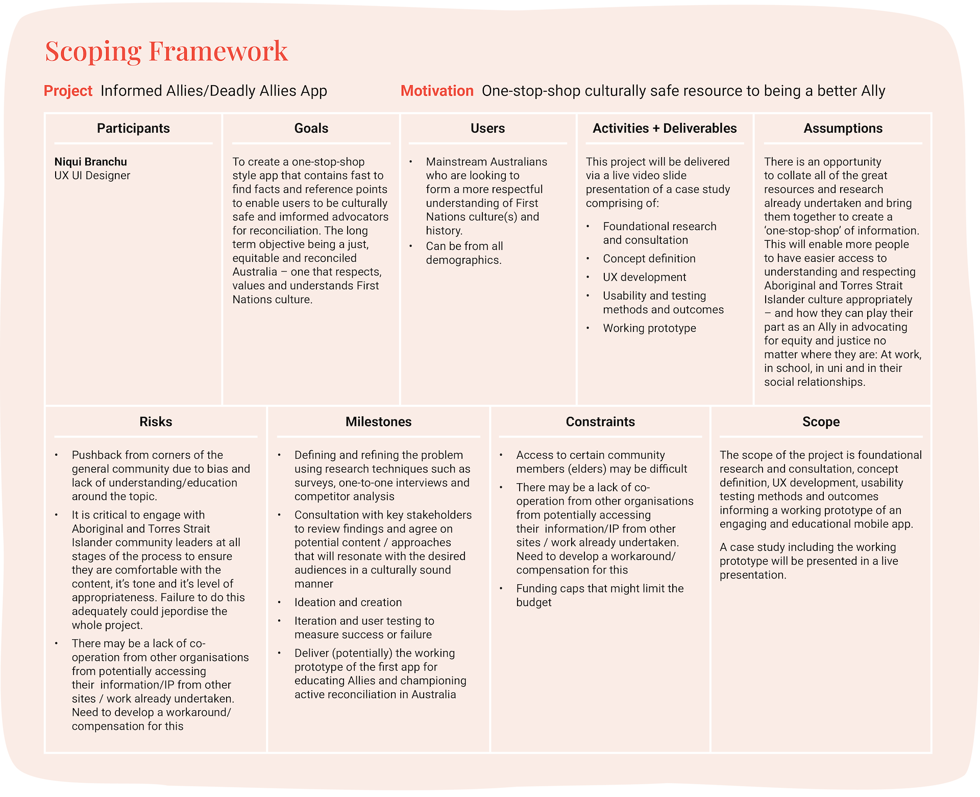 Given that racism is a consequence of ignorance, my idea was to try to give access to more educative resources on First Nations Australians to mainstream Australians. I developed a scoping framework to get a birds eye view of the objectives and scope of the project. They communicate deliverables and outcomes as well as identifying potential risks and how these might be mitigated.