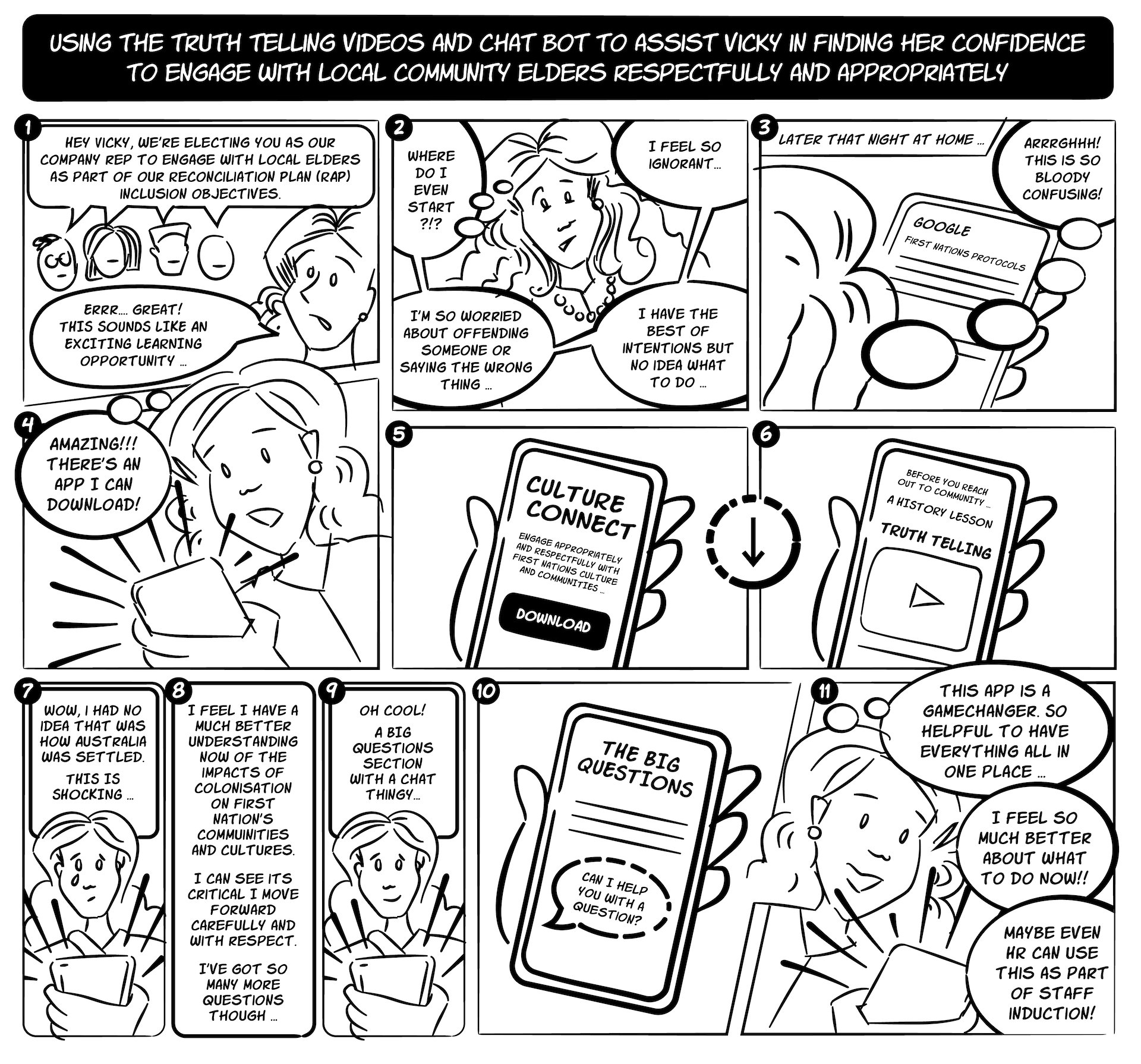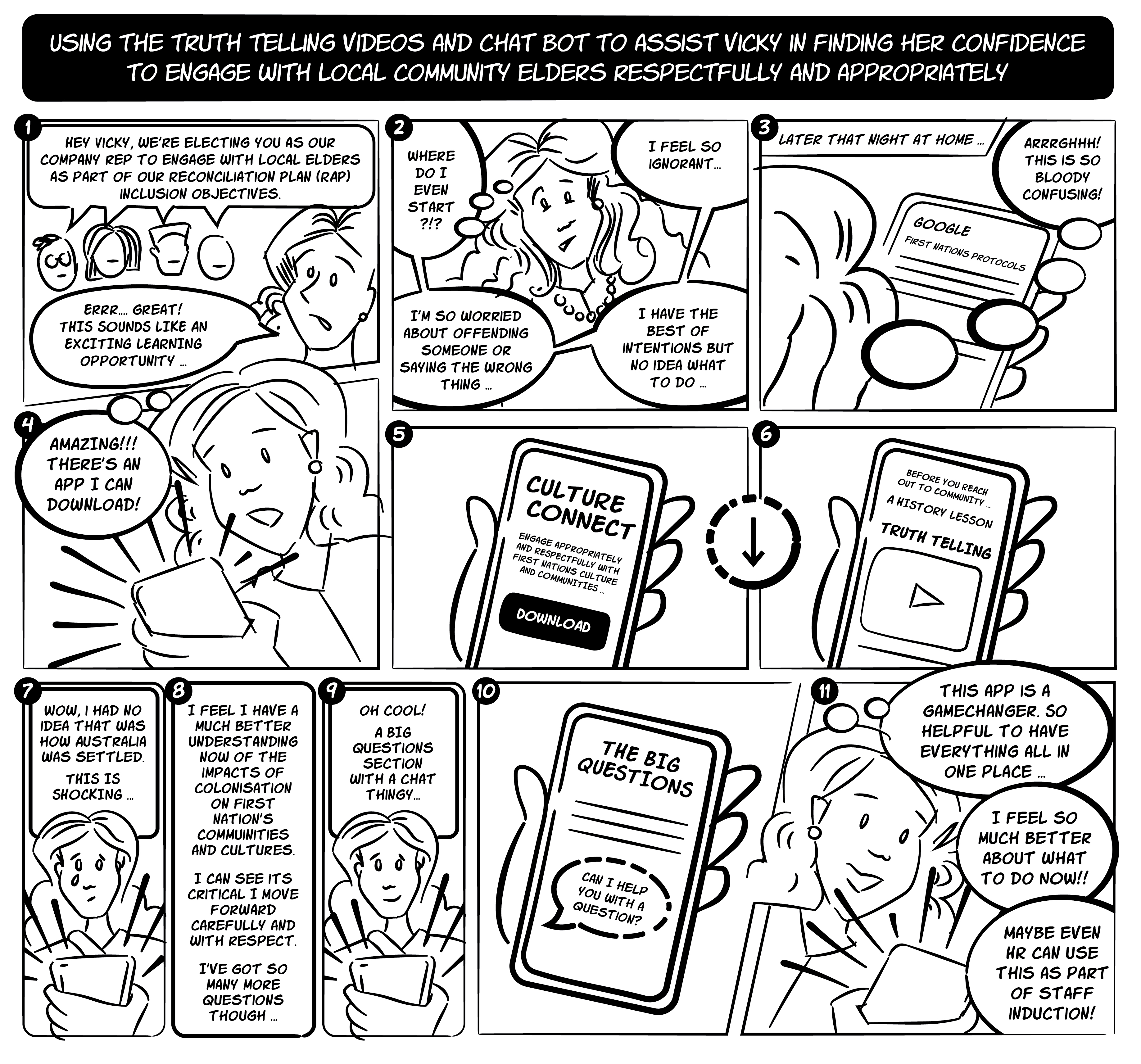 A storyboard (using my own illustrations) to outline a potential user journey Vicky might take.