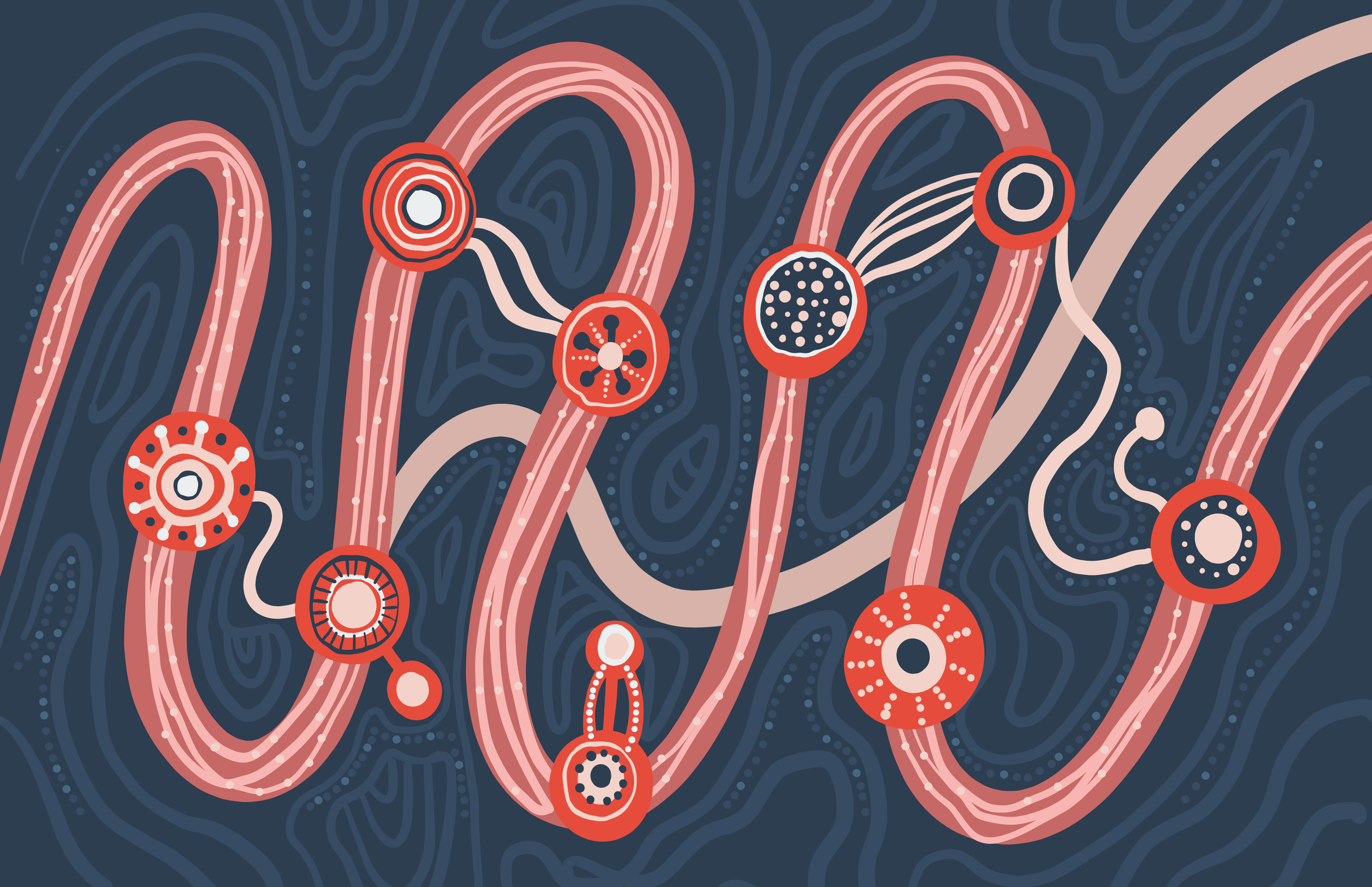A number of years ago, I was very lucky to have an original artwork created for me by Goreng Goreng artist Rachael Sarra. This artwork represents the story of my life which was portrayed as a learning story. As this product is all about learning, the stories aligned. I approached Rachael and she gave her permission for me to use her artwork in this project. If this were a real world project a new artwork would have to be commissioned with a specific story that speaks directly to the product.