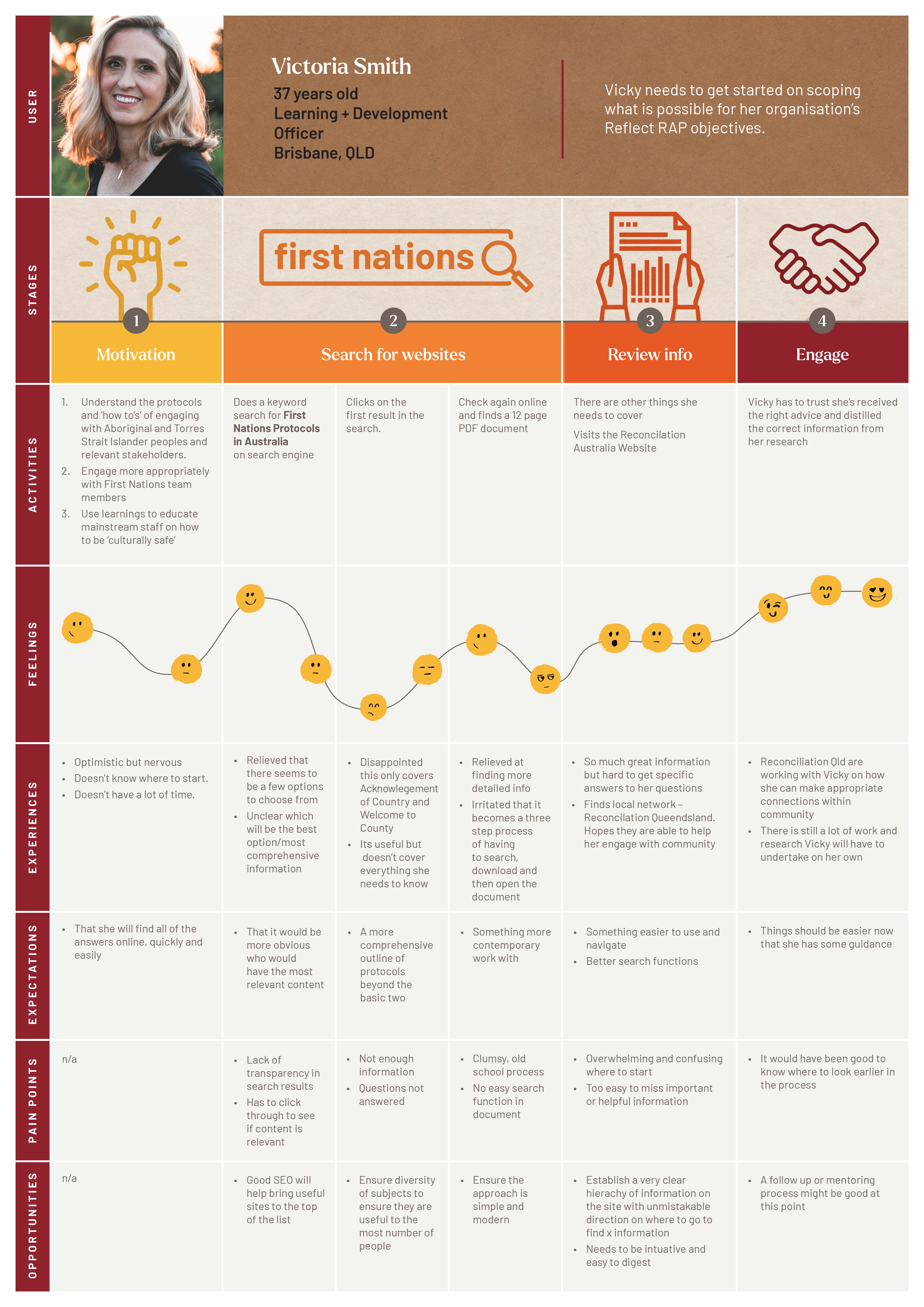 I developed a Journey Map for this persona to get an overview of Vicky’s user experience over a specific timeline. I observed different interactions and experiences, and noted pain points and opportunities throughout the process. This helped me identify trends and patterns to take forward into the next phase.