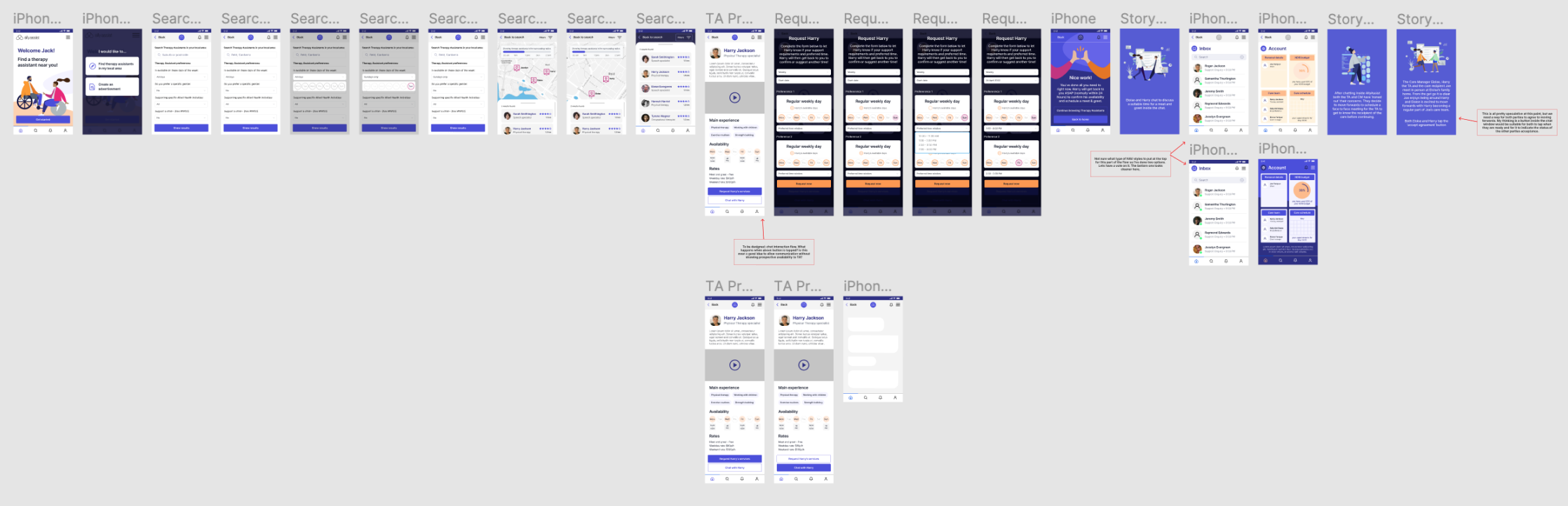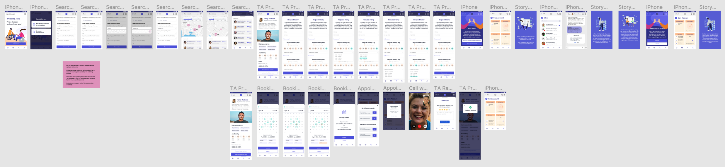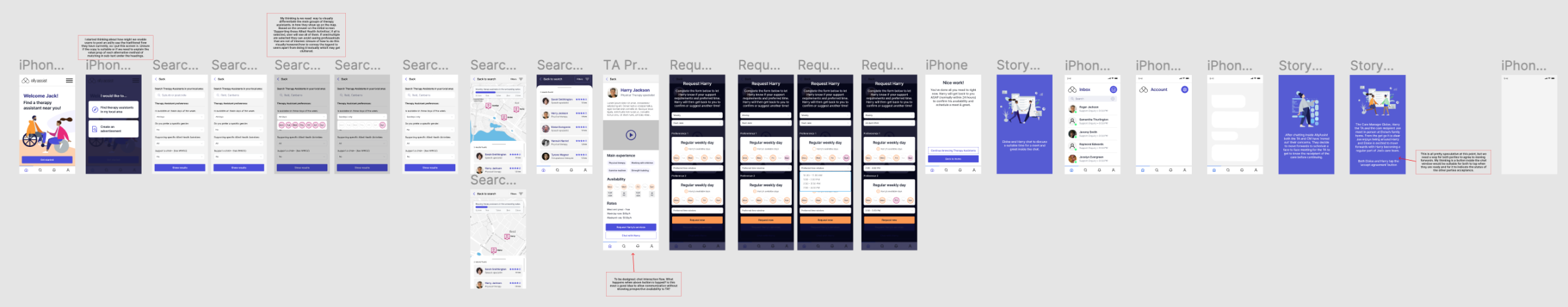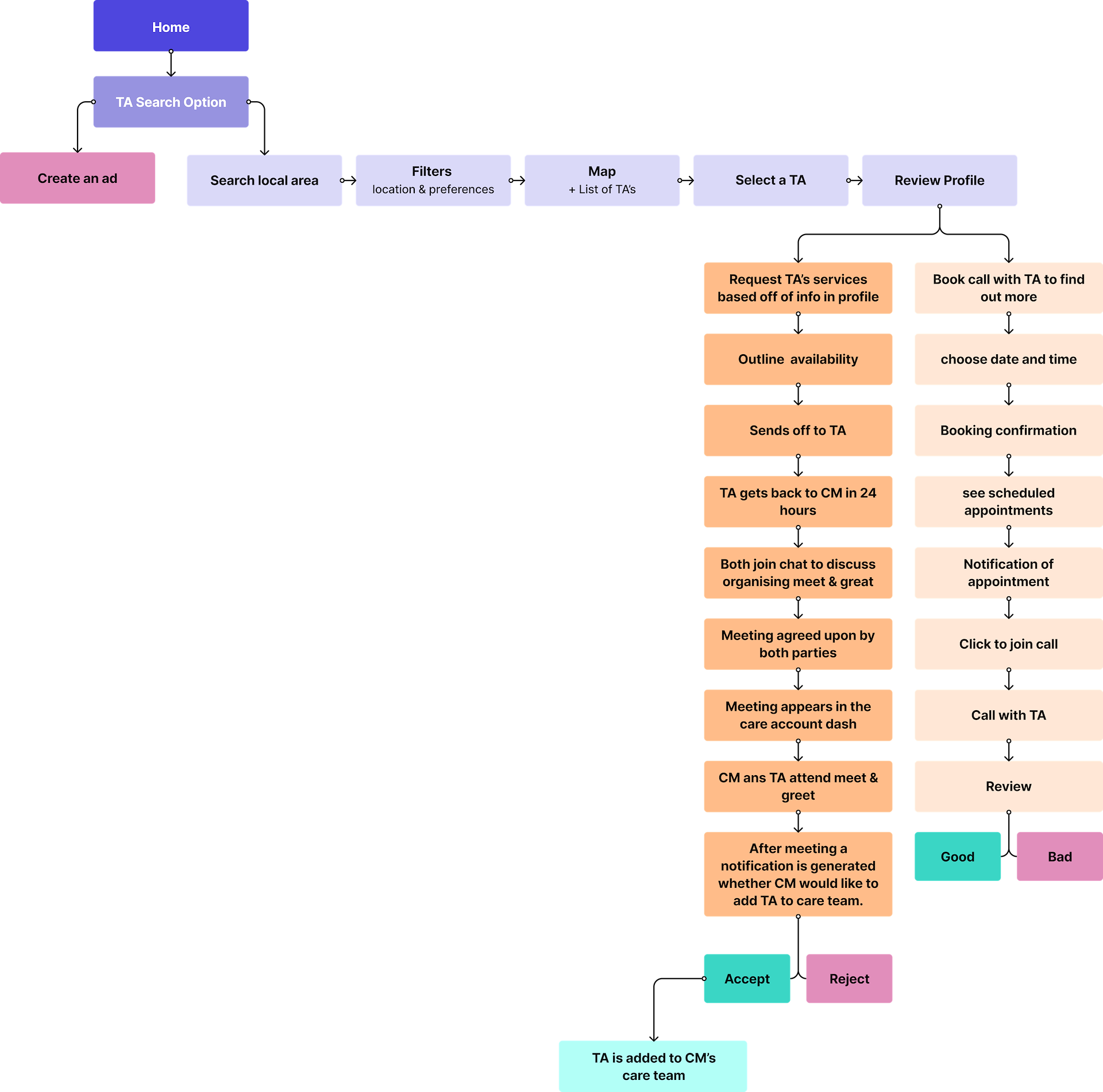 One of our time saving ideas was to have a user flow whereby the client manager (CM) could search for a therapy assistant (TA) themselves, rather than waiting for a therapy assistant to apply to work for them.