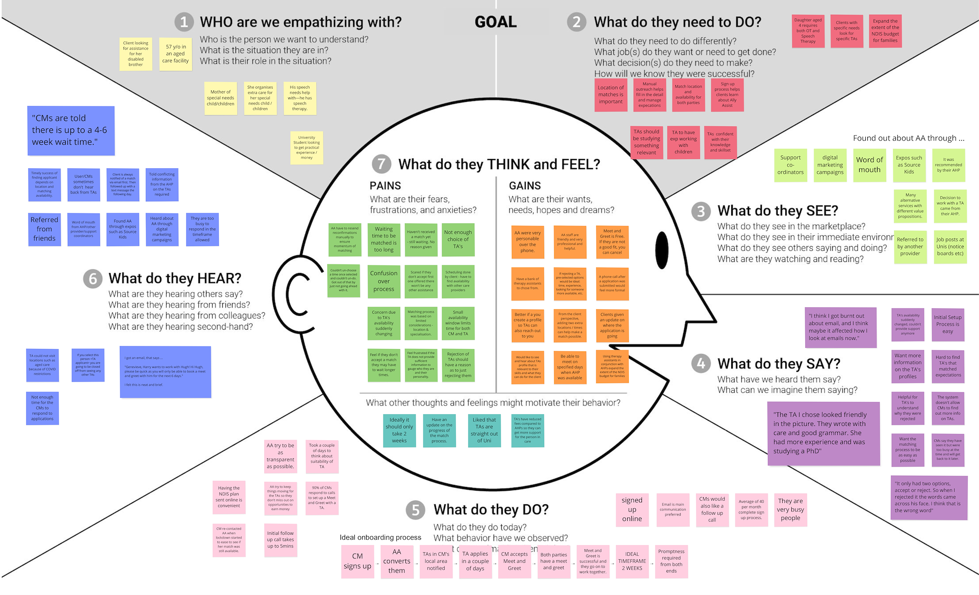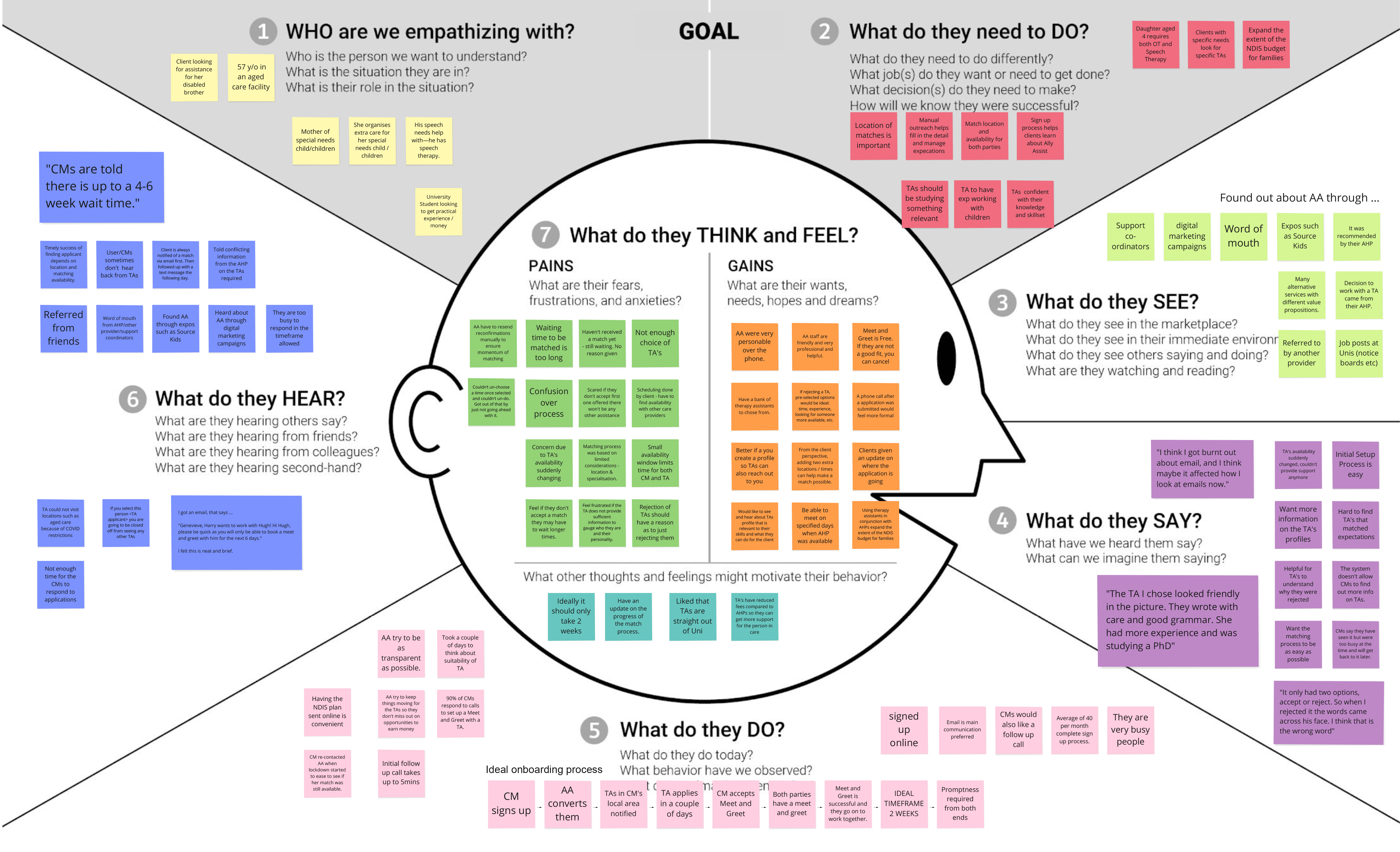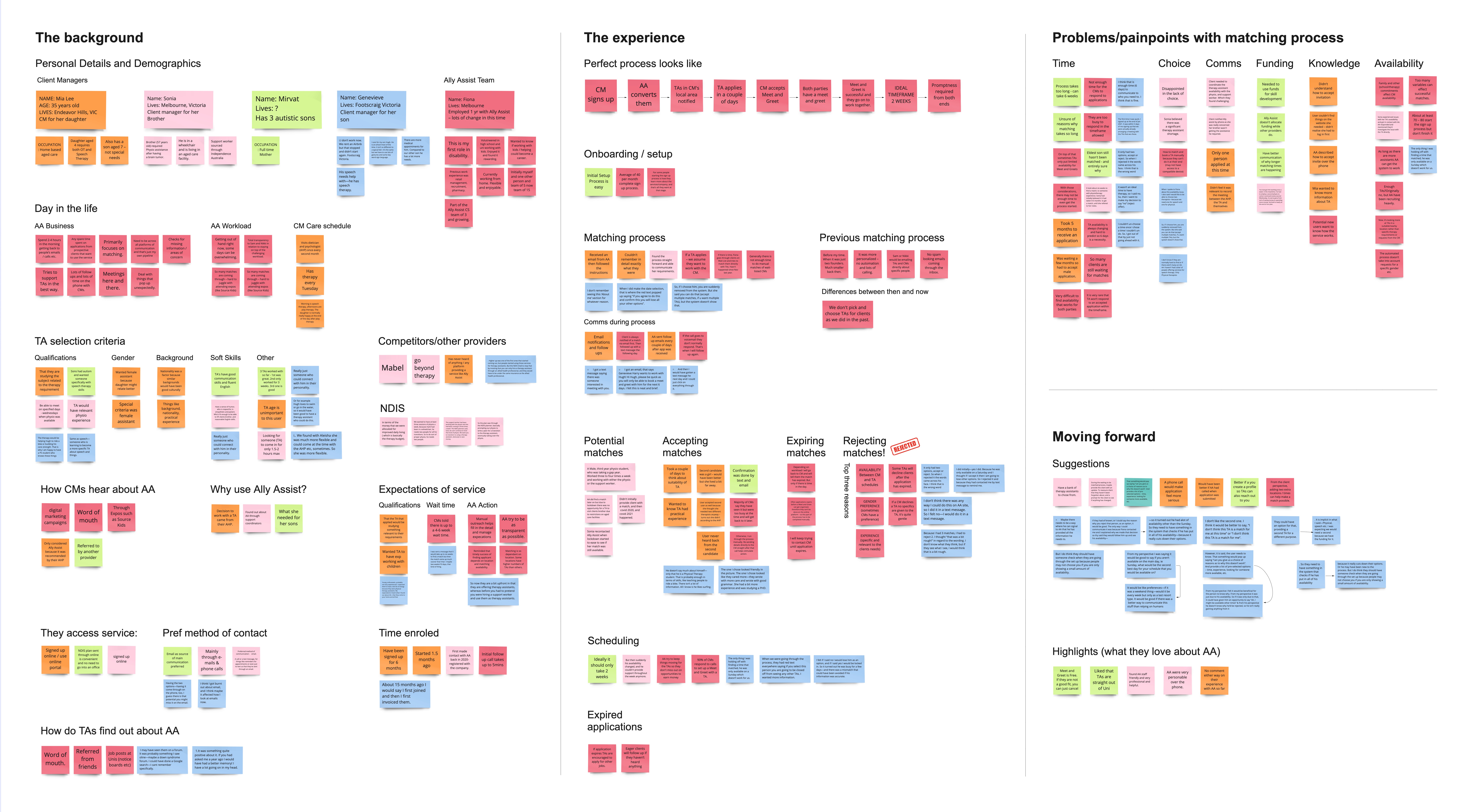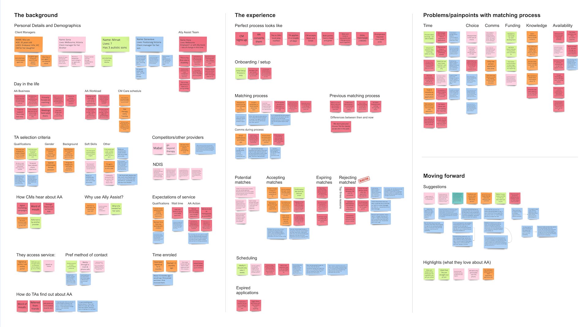 We interviewed the head of customer services at Ally Assist to walk us through the current user flows of both the onboarding procedure and the matching procedure to get her insights and find out where she felt the pain points were. We included all of her comments and observations in our Affinity Map.