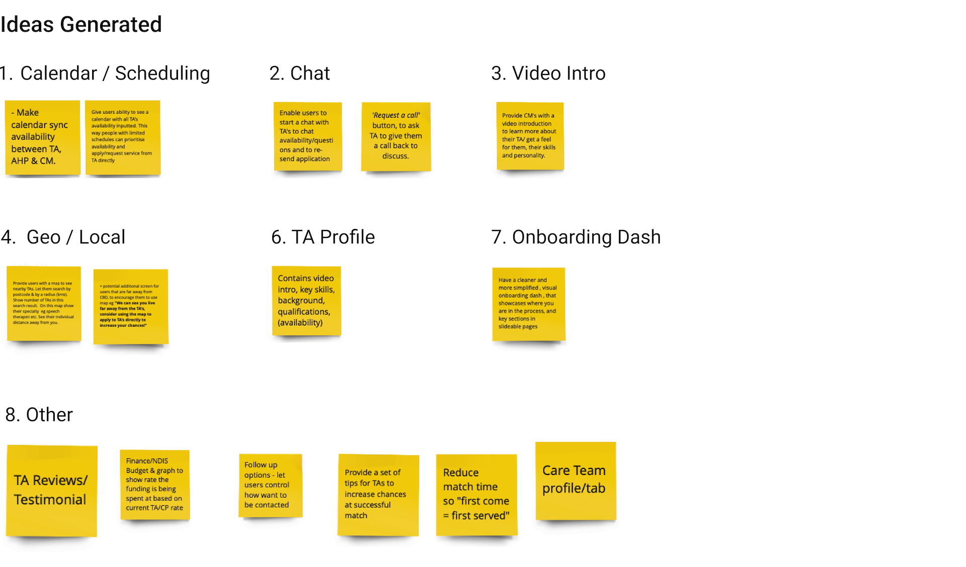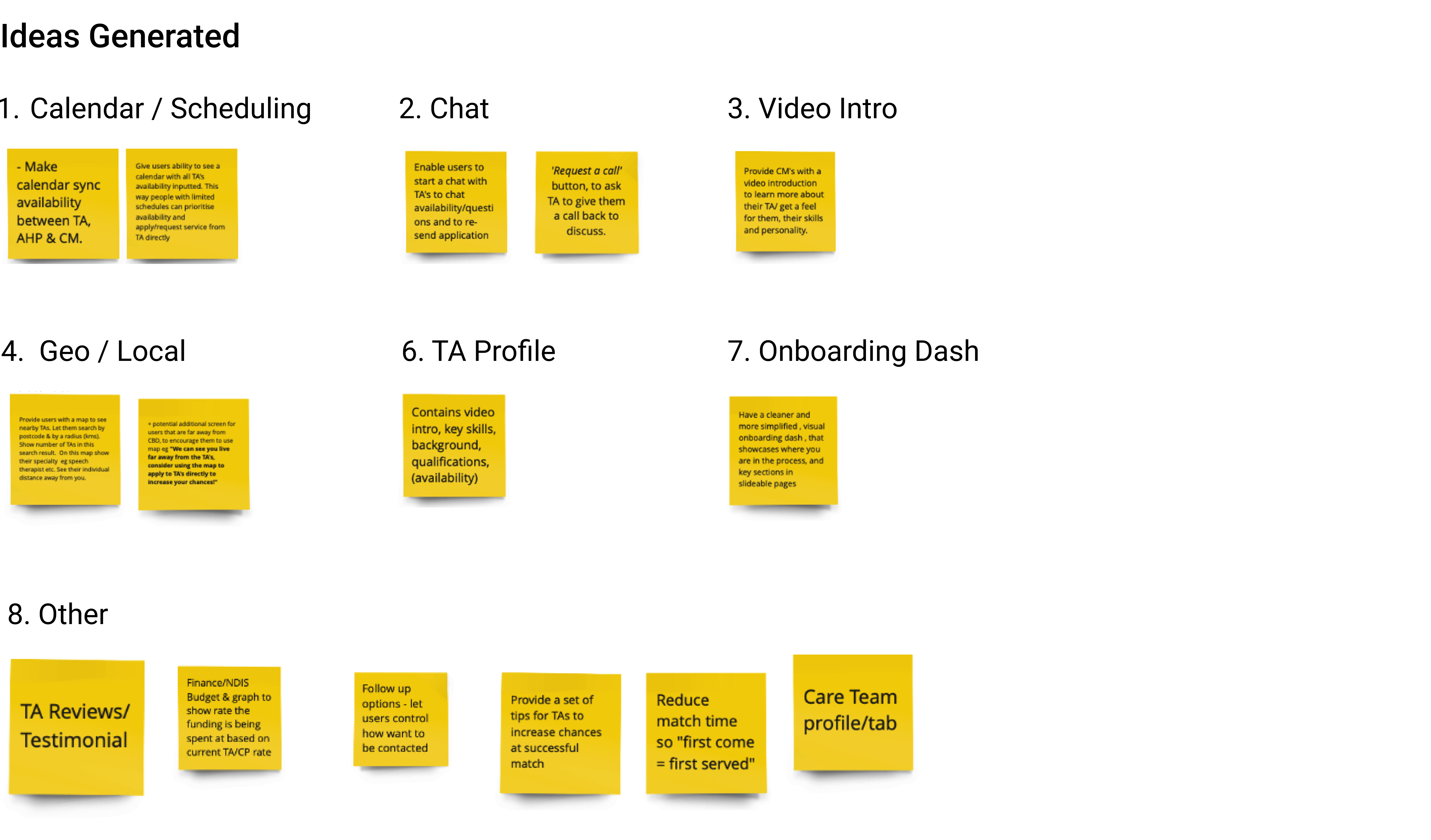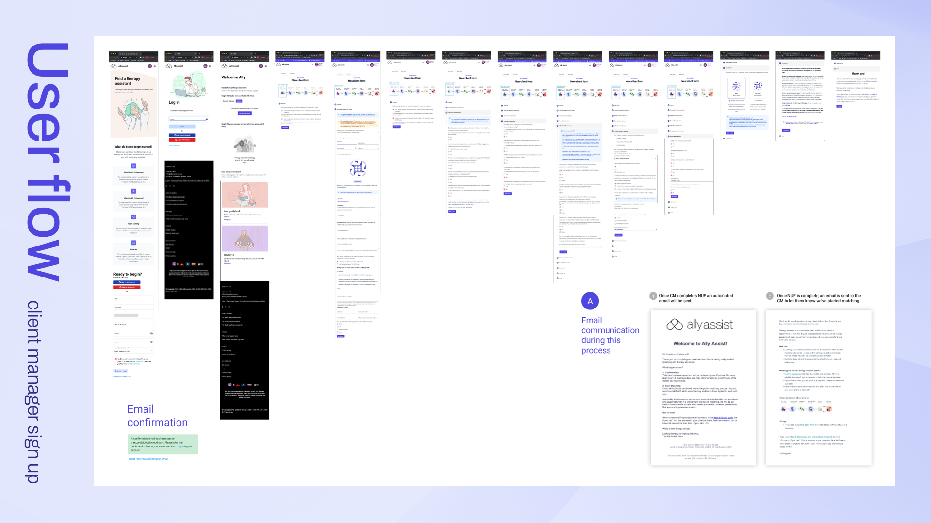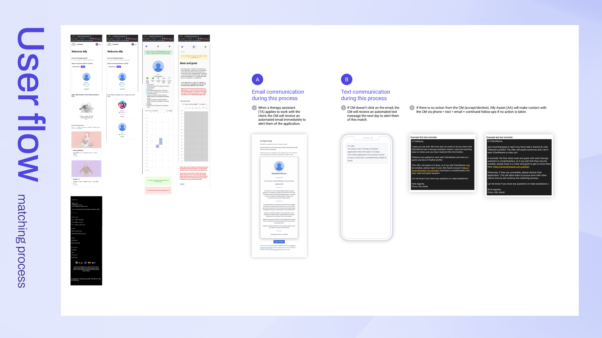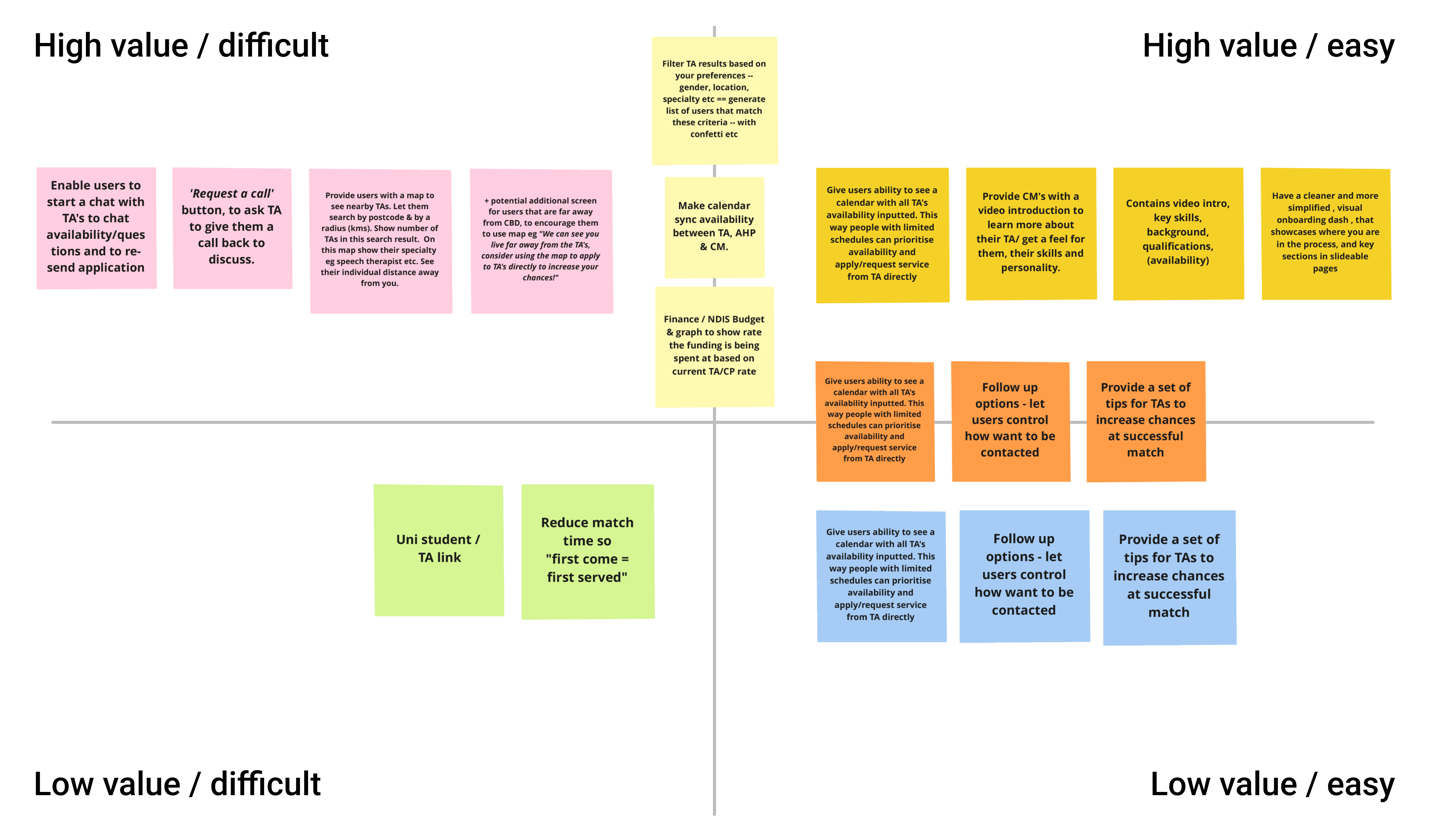 We interviewed the head of customer services at Ally Assist to walk us through the current user flows of both the onboarding procedure and the matching procedure to get her insights and find out where she felt the pain points were. We included all of her comments and observations in our Affinity Map.