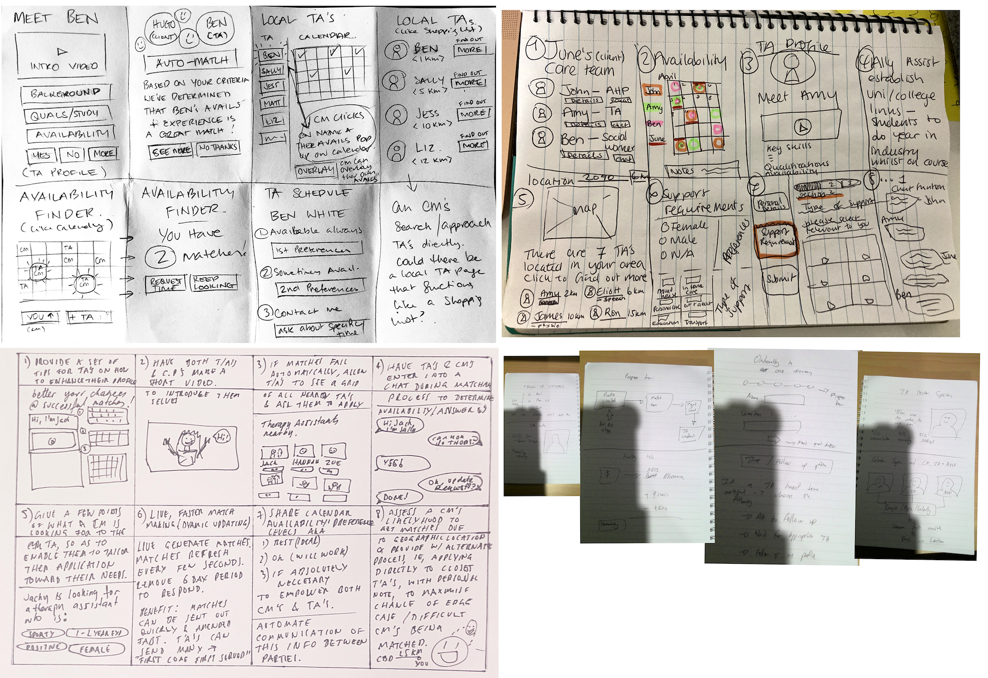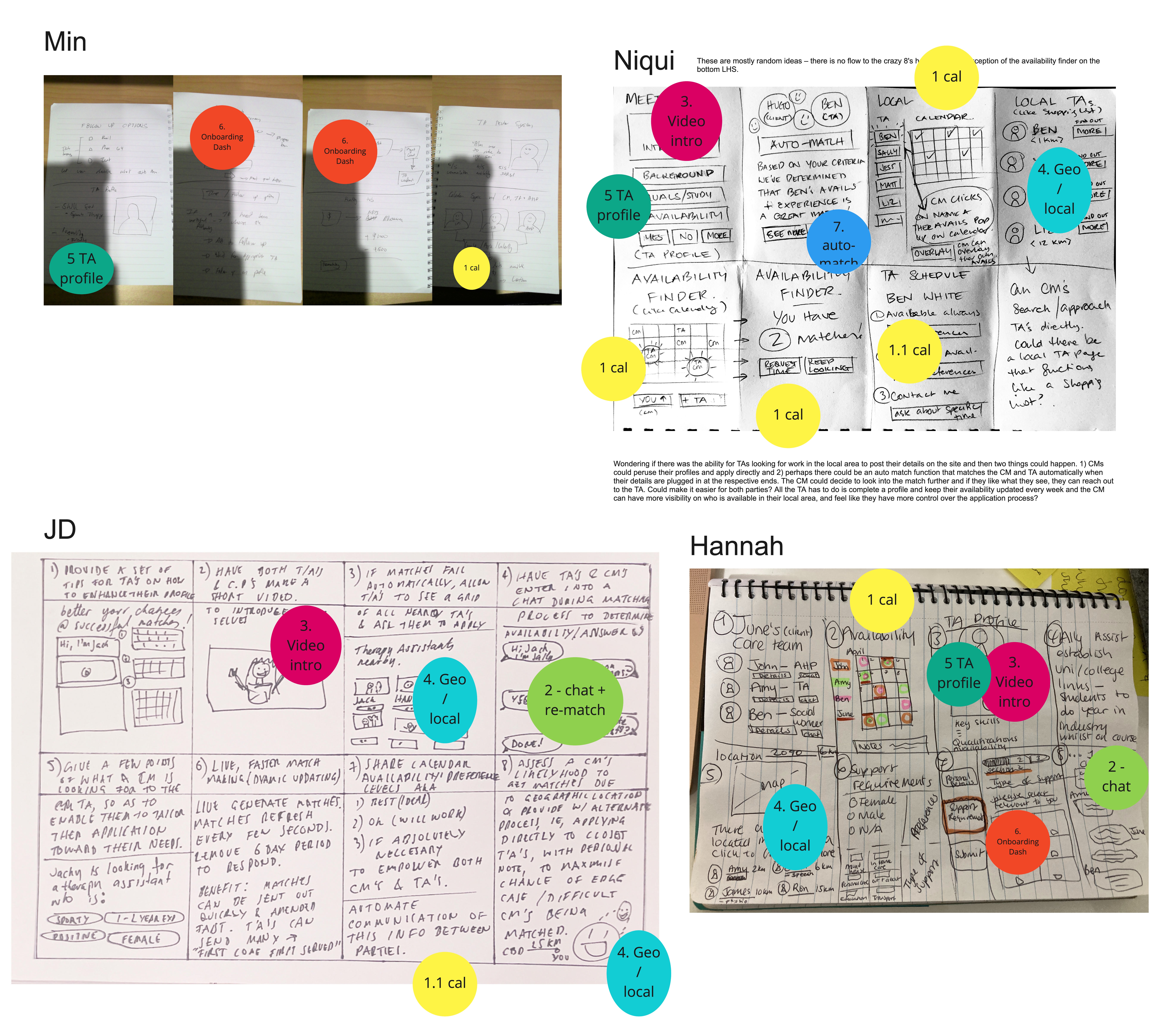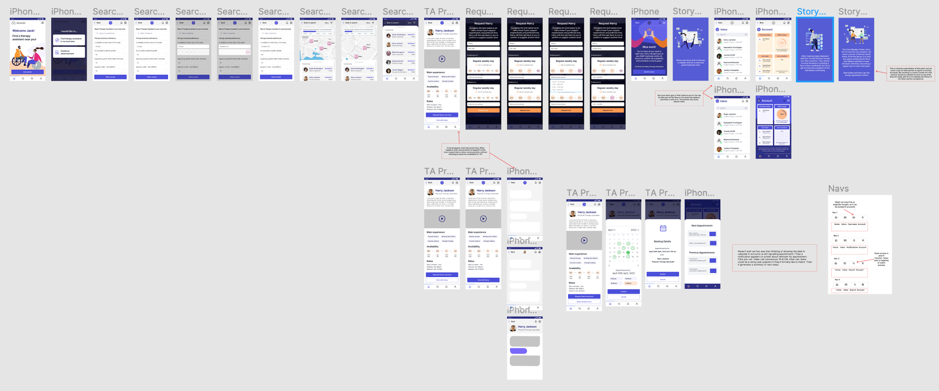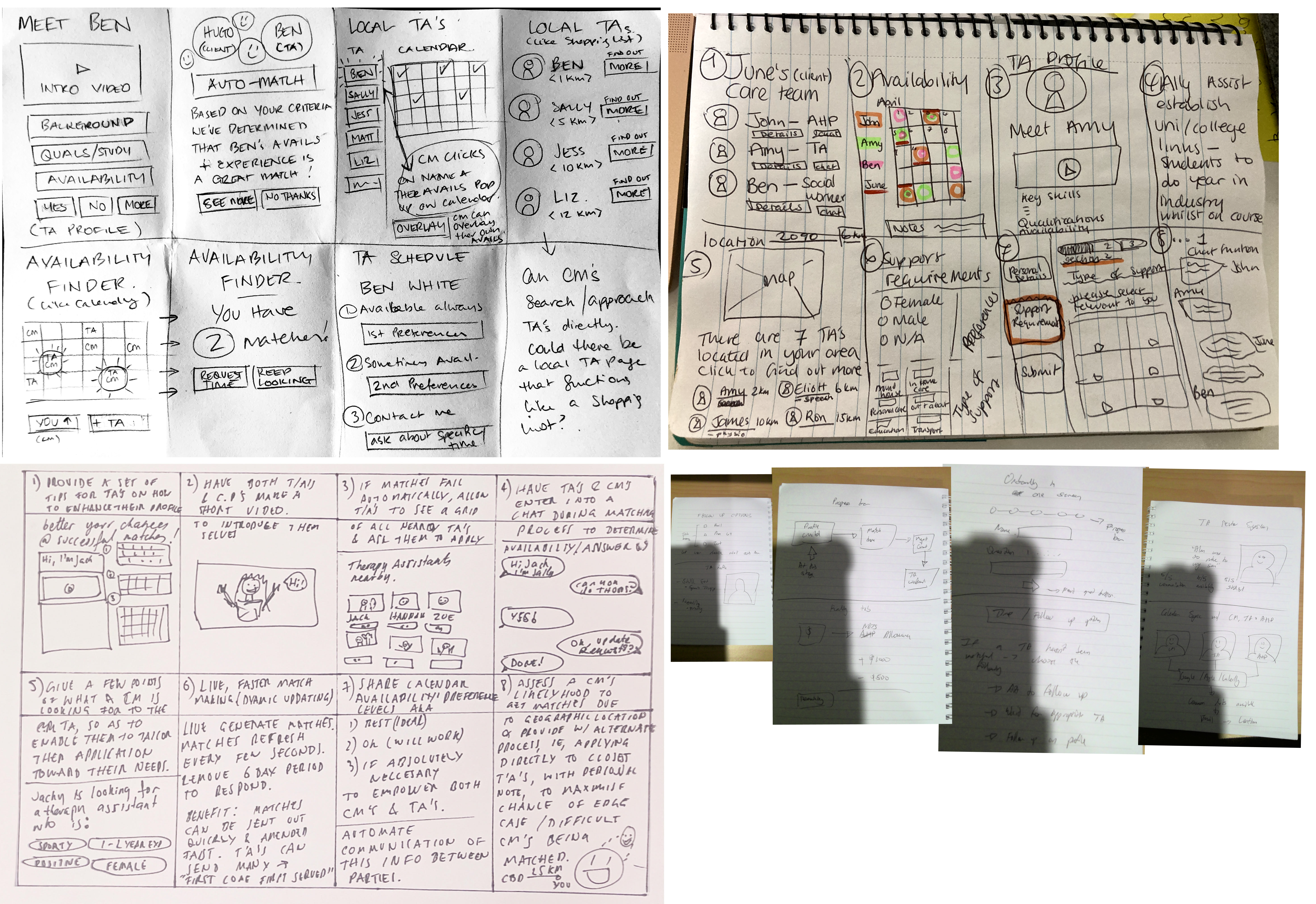 Another thing the research threw up was that location was a critical component in the success of a match. As part of the user flow where a CM is searching for a TA, we included a map function which would be able to show the user who their nearest therapy assistants were. Availability between both parties was also a huge factor, so we ideated on simple ways to overlay calendars to try and take some of the back and forth out of the process.